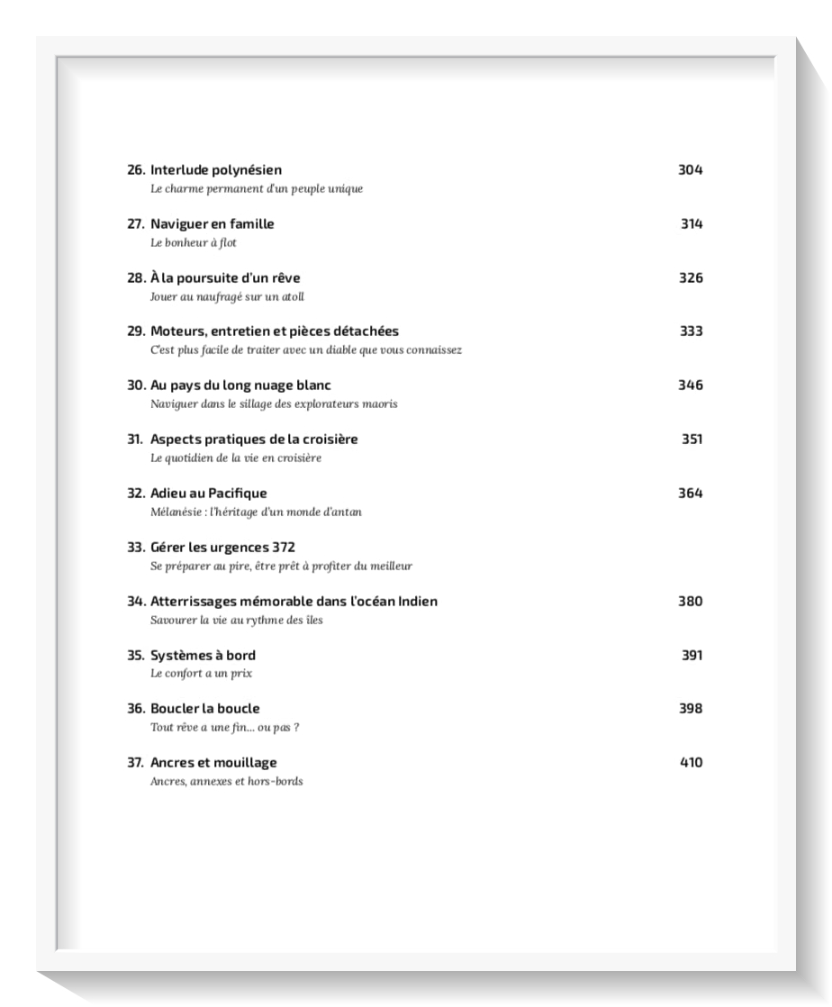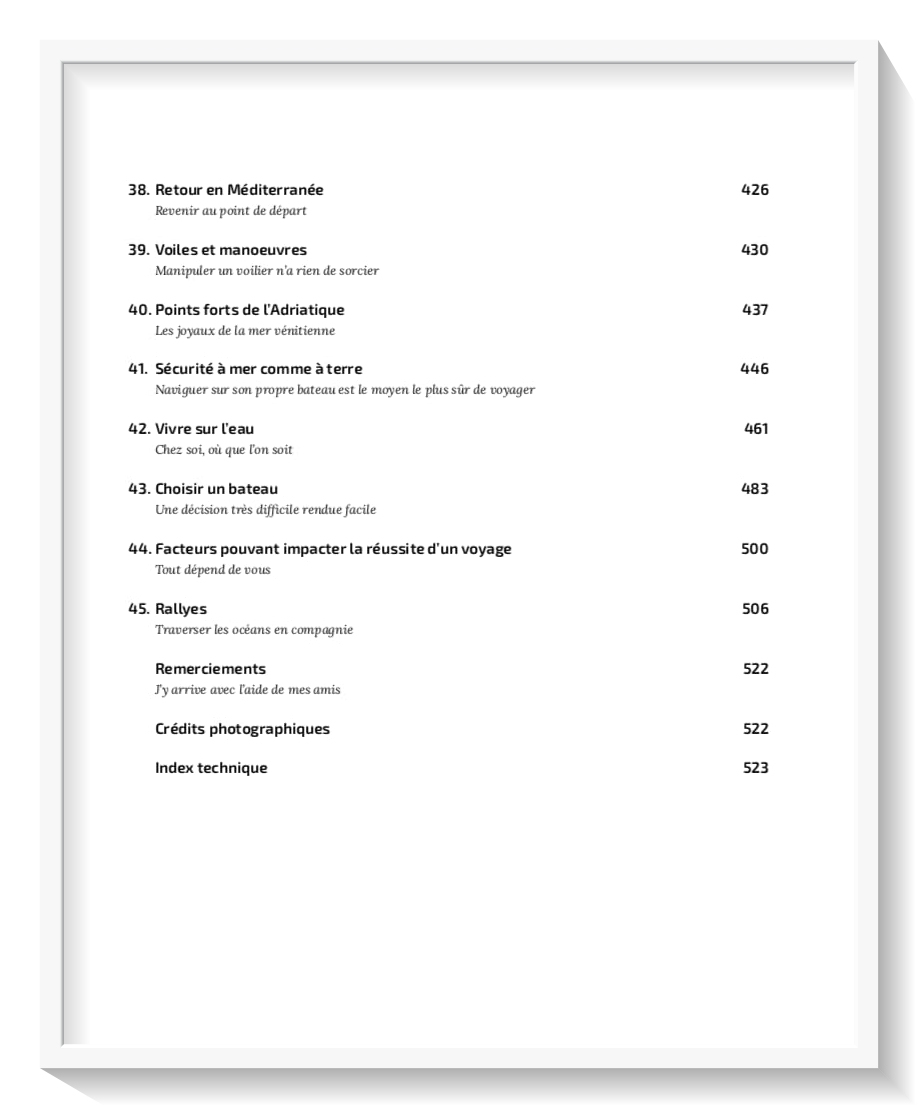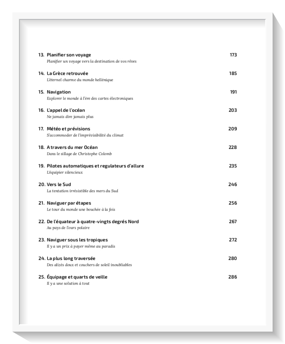 Bien qu’il s’adresse principalement aux marins qui envisagent ou préparent un voyage de longue durée, ce livre plaira également aux navigateurs océaniques expérimentés ainsi qu’a toute personne passionnée par la mer et la voile.